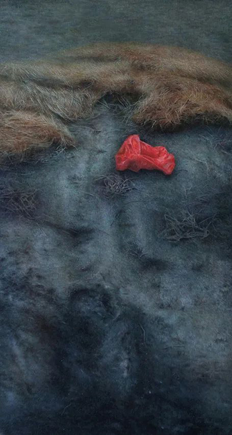 《红色物语》系列则是见物不见人,一团纠结扭曲的红色被置于不同的荒野环境中,应当是被红色物化了的人,当然,如果没有其他作品对红的界定,这一团红色也可以是荒野中挣扎的生命体。