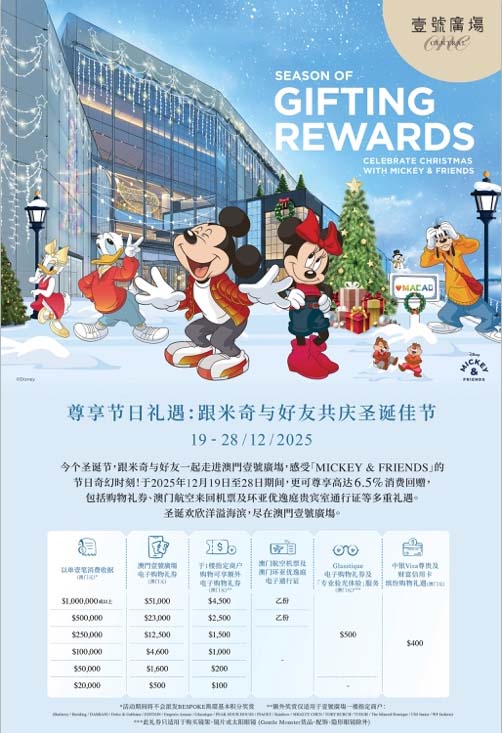 今年圣诞,壹号广塲因米奇与好友带来的节日魔法而格外闪耀。为了让顾客与亲友分享佳节喜悦,壹号广塲特别推出“尊享节日礼遇”,活动期为2025年12月19日至28日。推广期间,BESPOKE会员可享高达6.5%消费回赠,以及一系列精选节日奖赏,包括澳门壹号广塲购物礼券、澳门航空机票连环亚优逸庭贵宾室通行证等多重礼遇。中银Visa卡用户更可额外获赠澳门元400独家奖赏,为佳节再添惊喜。