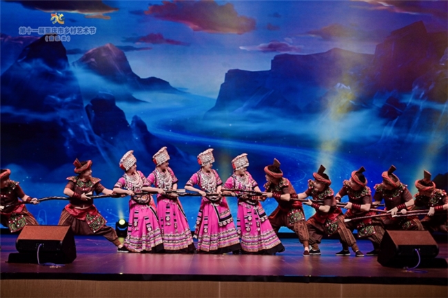 她也不是守旧的匠人。她是那棵既扎根深远、又枝叶向着新时代阳光蓬勃伸展的大树。她大胆地将激光投影的幻美,织入粗砺的民间舞步;让交响乐的宏大叙事,为高亢的山歌托底。她在土陶瓮般的古朴质感中,注入现代审美的清泉,让传统在当代的舞台上,完成一场“醇美的发酵”。这“守正创新”,不是口号,是她艺术实践的生动写照。于是,我们看到的《踩春》,既有“牛擦背”般的乡野拙趣,又有舞蹈技巧的精准爆发;看到的《花山花》,既有苗寨儿女踏歌而舞、银饰摇曳、人花辉映的原生态生活图景,又有“裙摆翻涌似火”、“甩袖如波”等舞蹈编排所升华出的,如山河画卷般绚丽蓬勃的盛世风华;看到的《青山借我九丈九》,既有号子撼人心魄的原始力量,又有交互和声赋予的、直击灵魂的崇高感。