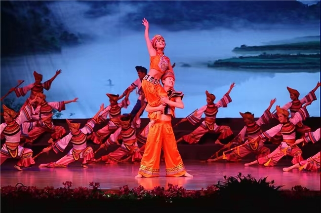 作为土家族艺术家,夏冰始终将民族文化作为创作源泉。在《妹娃要过河》《妹娃山歌哈尕扎》等代表作中,她创造性地将土家摆手舞、苗岭情歌等原生元素与现代编舞技法融合,形成独特的“土风现代舞”风格。这种转译不仅体现在动作设计上--如用肩胛骨起伏模拟山脊线、指尖颤动对应露珠坠落节奏,更深入到文化符号的解构与重构:《幺妹上花轿》将哭嫁仪式中的红绢从束缚象征转化为飞翔意象,完成女性意识的现代觉醒。