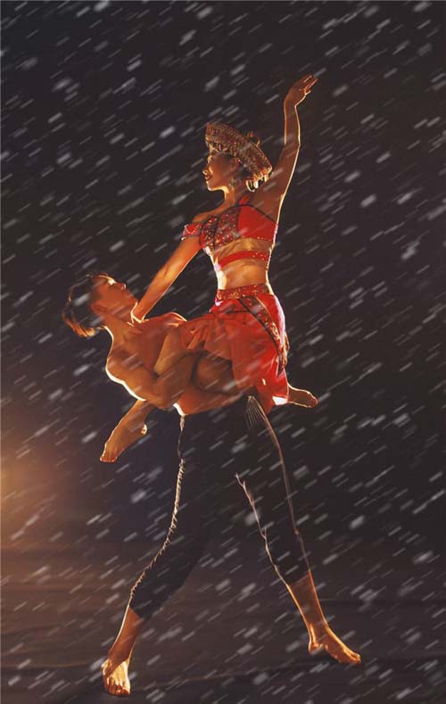 《野山》的创作灵感来源于夏冰对童年记忆的追溯。作品中那些充满原始张力的动作设计--“凤凰展翅”、“犀牛望月”、“猛虎下山”等,都是她对大山生命力的艺术化再现。特别令人印象深刻的是舞蹈高潮部分的“抹黑”细节:女子在完成高难度托举后,将手上的黑色颜料抹在男子脸上,这个充满仪式感的动作象征着爱情中的占有与铭记,也隐喻着生命与生命的相互交融。