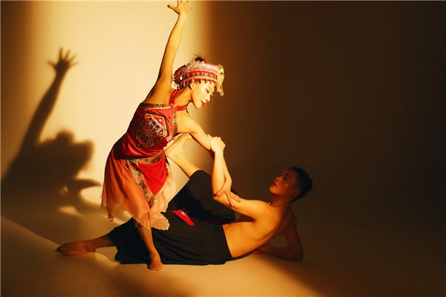 《野山》的创作灵感来源于夏冰对童年记忆的追溯。作品中那些充满原始张力的动作设计--“凤凰展翅”、“犀牛望月”、“猛虎下山”等,都是她对大山生命力的艺术化再现。特别令人印象深刻的是舞蹈高潮部分的“抹黑”细节:女子在完成高难度托举后,将手上的黑色颜料抹在男子脸上,这个充满仪式感的动作象征着爱情中的占有与铭记,也隐喻着生命与生命的相互交融。